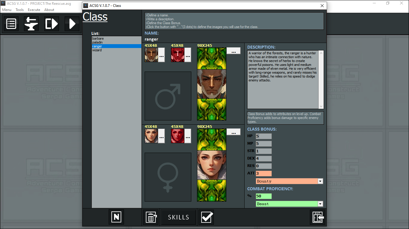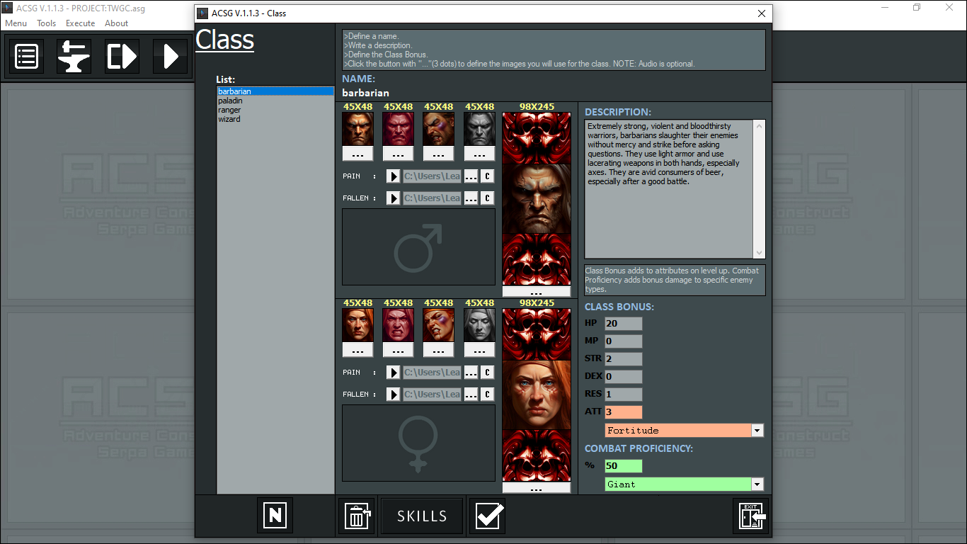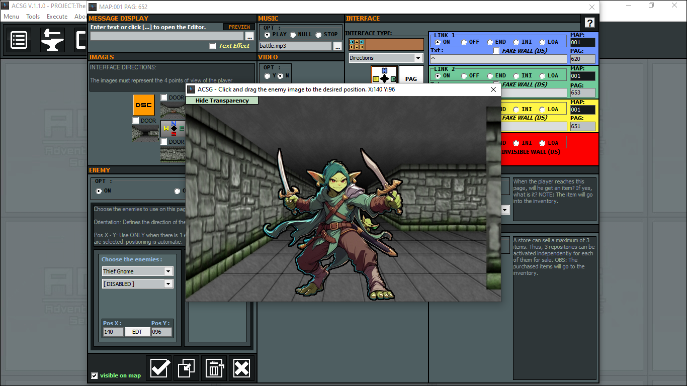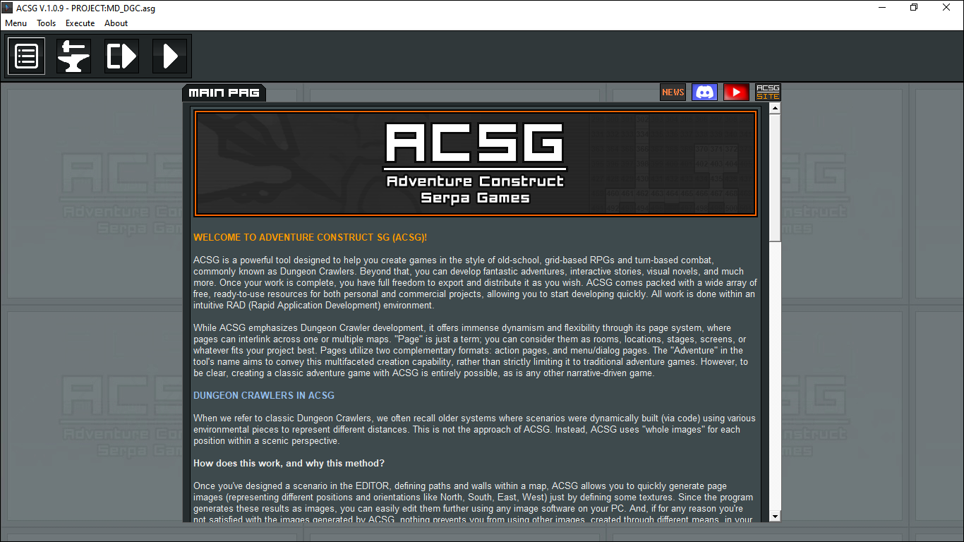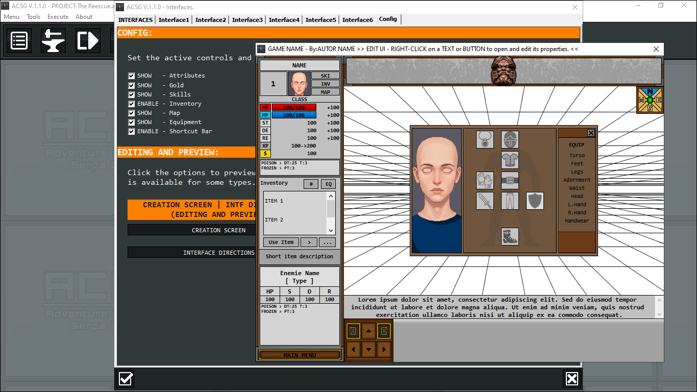 The Adventure Construct SG (ACSG) is a versatile and intuitive tool, ideal for game developers of all levels interested in creating narrative-driven games. With ACSG, it is possible to develop everything from immersive first-person Dungeon Crawlers, with visuals, strategic combat, engaging dialogues, and audiovisual resources, to captivating Visual Novels and creative text-based games.