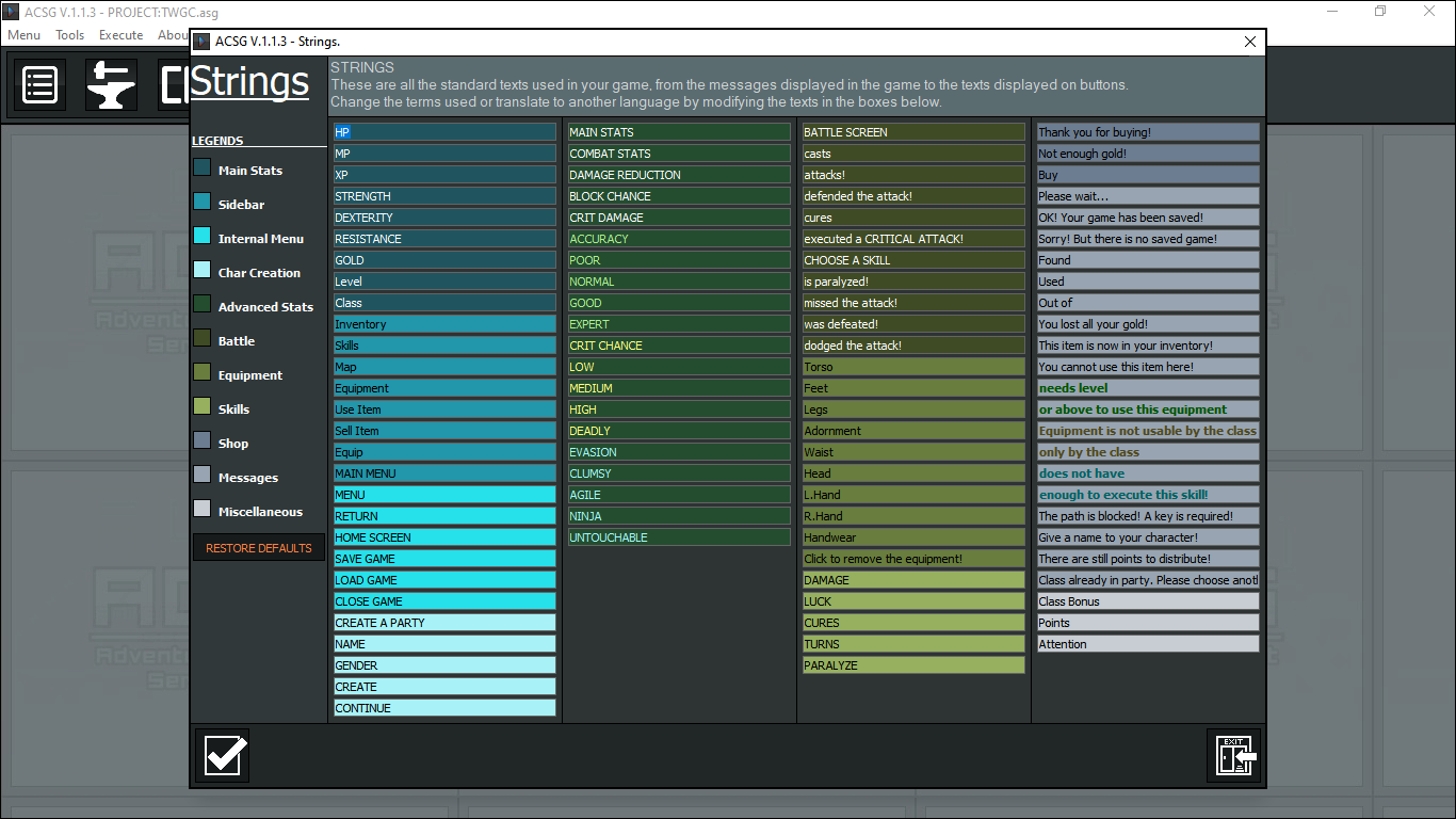 - Versatile Game Mechanics: Incorporate complex mechanics such as turn-based combat, inventory systems, character classes, a variety of items, challenging enemies, and customizable skills. ACSG includes pre-built basic RPG mechanics, allowing you to concentrate on game design. If you prefer, you can create interactive stories, presentations, or differentiated eBooks without using RPG elements.